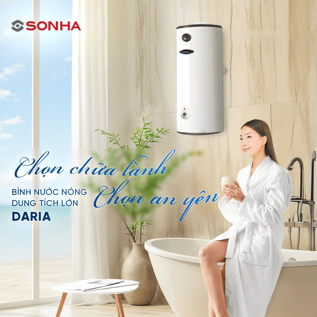 Ví dụ như bình nước nóng dung tích lớn Daria của Sơn Hà, một trong những thương hiệu nổi bật trên thị trường, được biết đến với các sản phẩm có độ bền cao, tính năng an toàn và khả năng tiết kiệm năng lượng. Chọn một thương hiệu có uy tín giúp đảm bảo bạn không phải lo lắng về các sự cố kỹ thuật hay hư hỏng sau một thời gian sử dụng.