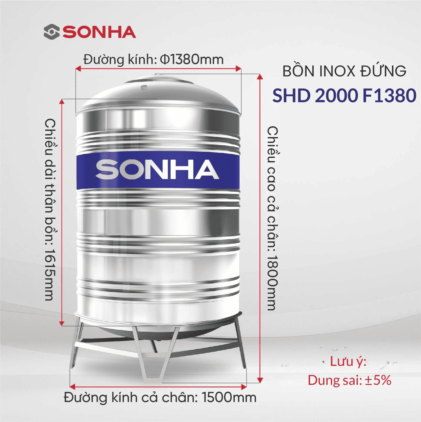 Được sản xuất bằng vật liệu inox SUS304 cao cấp trên dây chuyền công nghệ hiện đại của Nhật Bản đạt tiêu chuẩn Quốc tế ISO 9001-2008, Bồn inox Sơn Hà mẫu đứng (SHD) 2.000 (F1380) có thiết kế tối ưu phù hợp với nhiều loại hình kiến trúc nhà ở, độ cứng và độ bền cực cao.