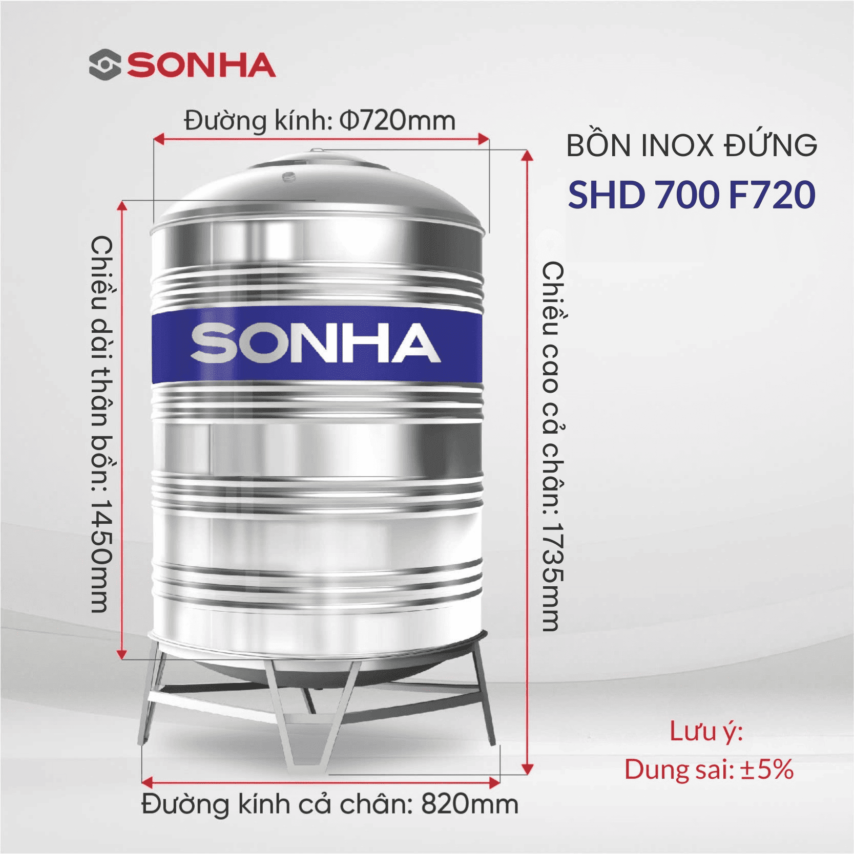 Được sản xuất bằng vật liệu inox SUS304 cao cấp trên dây chuyền công nghệ hiện đại của Nhật Bản đạt tiêu chuẩn Quốc tế ISO 9001-2008, Bồn inox Sơn Hà mẫu đứng (SHD) 700 (F0720) có thiết kế tối ưu phù hợp với nhiều loại hình kiến trúc nhà ở, độ cứng và độ bền cực cao.