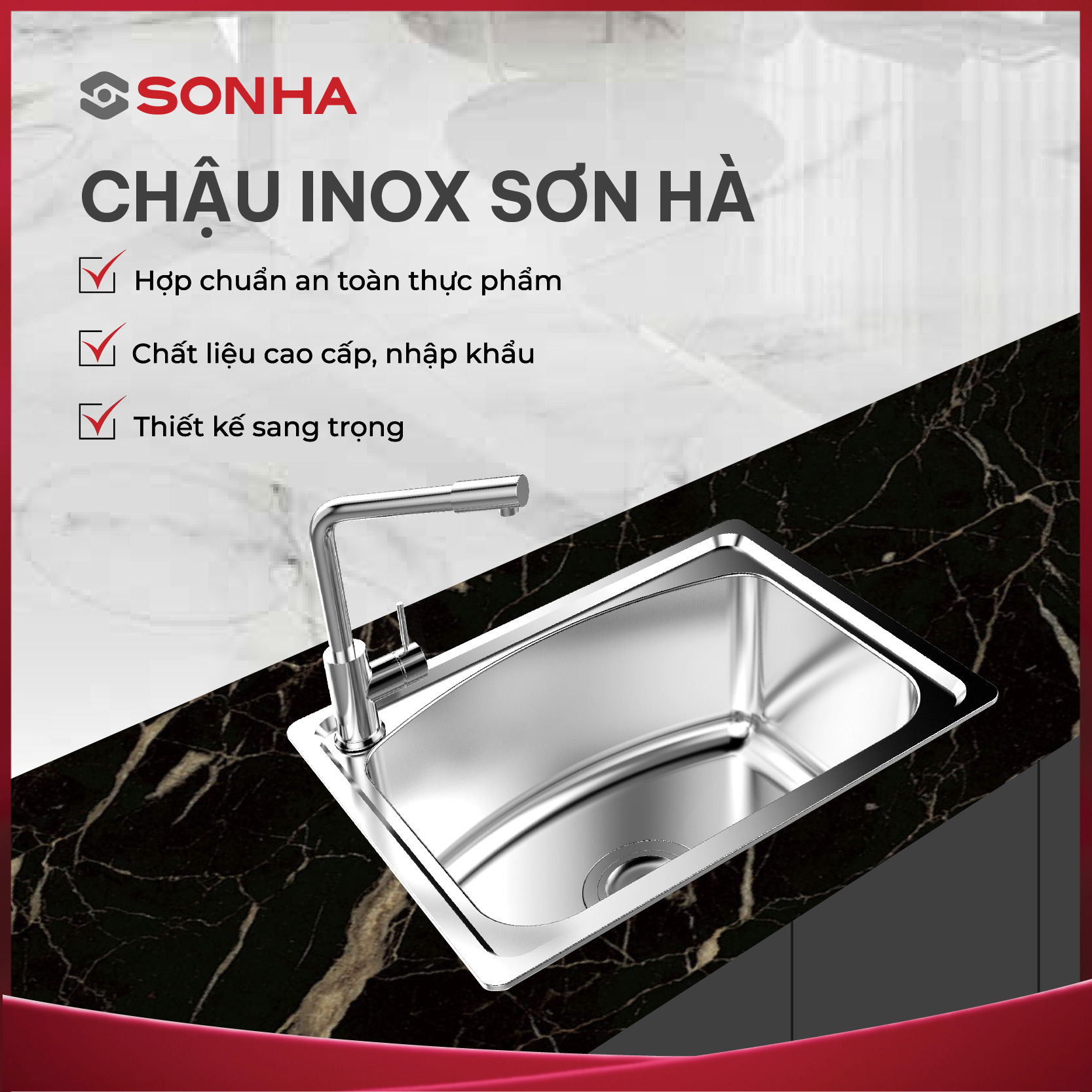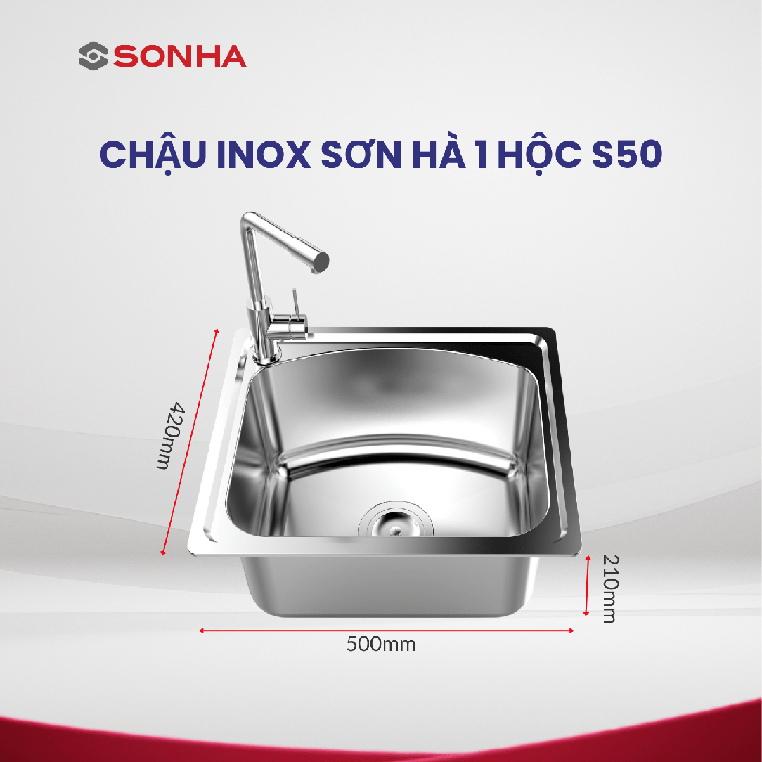 Sản xuất từ chất liệu inox nhập khẩu siêu bền S50 trên dây chuyền công nghệ ép liền khối hiện đại nhất Việt Nam, Chậu rửa bát cao cấp 1 hộc Sơn Hà S50 tối ưu hóa công năng sử dụng, thân thiện với môi trường, phù hợp với những căn hộ có diện tích vừa và nhỏ.