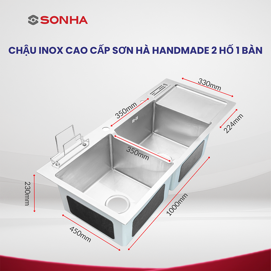 Sản xuất từ chất liệu inox nhập khẩu siêu bền SUS304 trên dây chuyền công nghệ ép liền khối hiện đại nhất Việt Nam, Chậu inox cao cấp Sơn Hà Handmade 2 hố 1 bàn tối ưu hóa không gian sử dụng, thân thiện với môi trường, là trợ thủ đắc lực cho công việc bếp núc của mọi gia đình