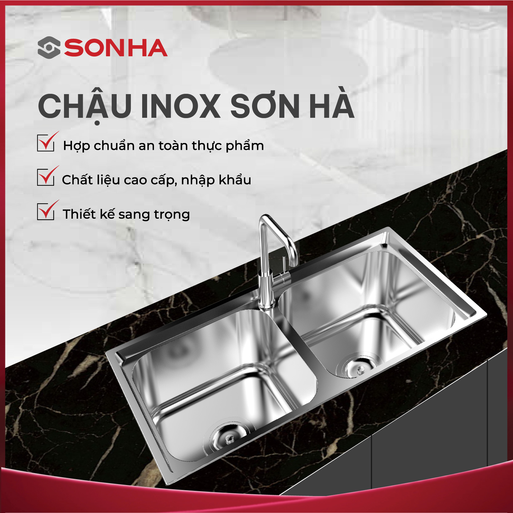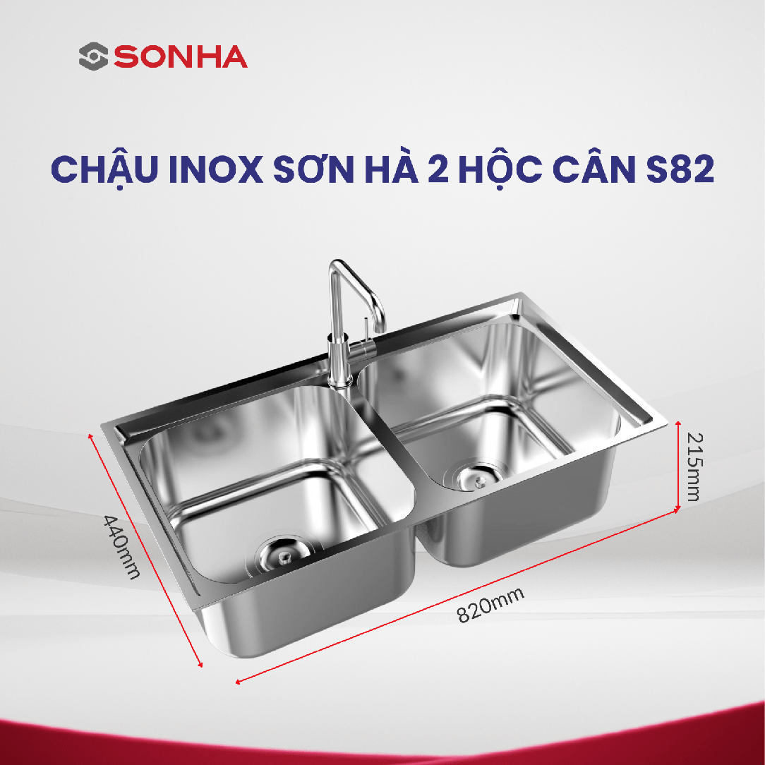 Sản xuất từ chất liệu inox nhập khẩu siêu bền S82 trên dây chuyền công nghệ ép liền khối hiện đại nhất Việt Nam, Chậu rửa bát cao cấp 2 hộc cân Sơn Hà S82 tối ưu hóa không gian sử dụng, thân thiện với môi trường, là trợ thủ đắc lực cho công việc bếp núc của mọi gia đình.