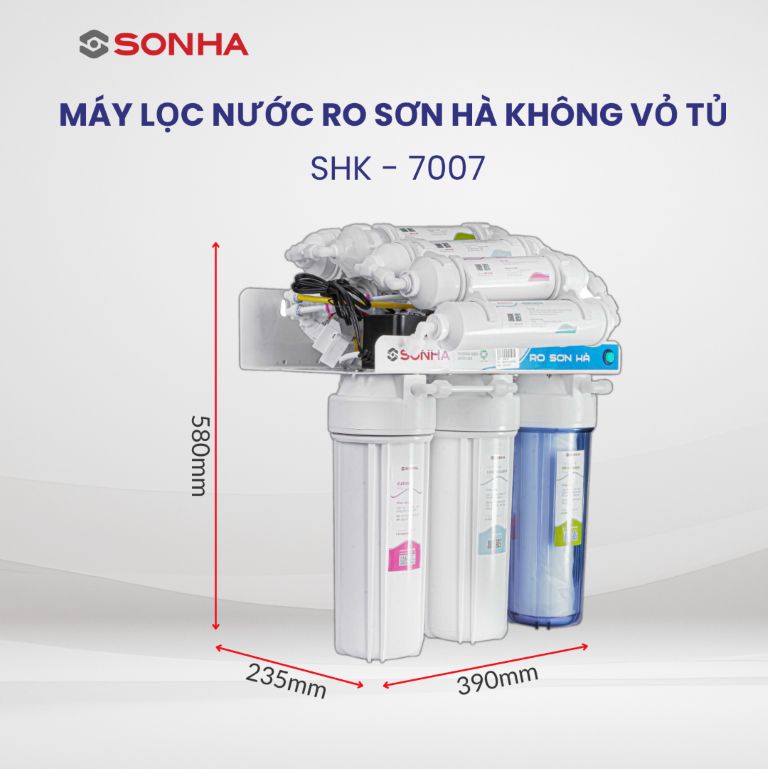 Sản phẩm máy lọc nước RO Sơn Hà 7 lõi không vỏ tủ của Tập đoàn Sơn Hà được sản xuất trên dây chuyền công nghệ hiện đại, tuân thủ nghiêm ngặt các tiêu chuẩn quốc tế về thiết bị an toàn nguồn nước. Màng lọc RO có màng lọc siêu nhỏ 0.0001 micro sản xuất tại Mỹ giúp nâng cao hiệu suất sử dụng và kéo dài tuổi thọ.