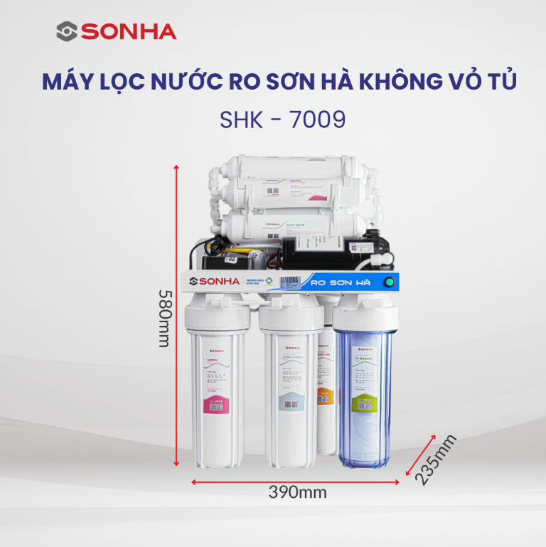 Sản phẩm máy lọc nước RO Sơn Hà 9 lõi không vỏ tủ của Tập đoàn Sơn Hà được sản xuất trên dây chuyền công nghệ hiện đại, tuân thủ nghiêm ngặt các tiêu chuẩn quốc tế về thiết bị an toàn nguồn nước. Màng lọc RO với màng lọc siêu nhỏ 0.0001 micro sản xuất tại Mỹ giúp nâng cao hiệu suất sử dụng và kéo dài tuổi thọ.