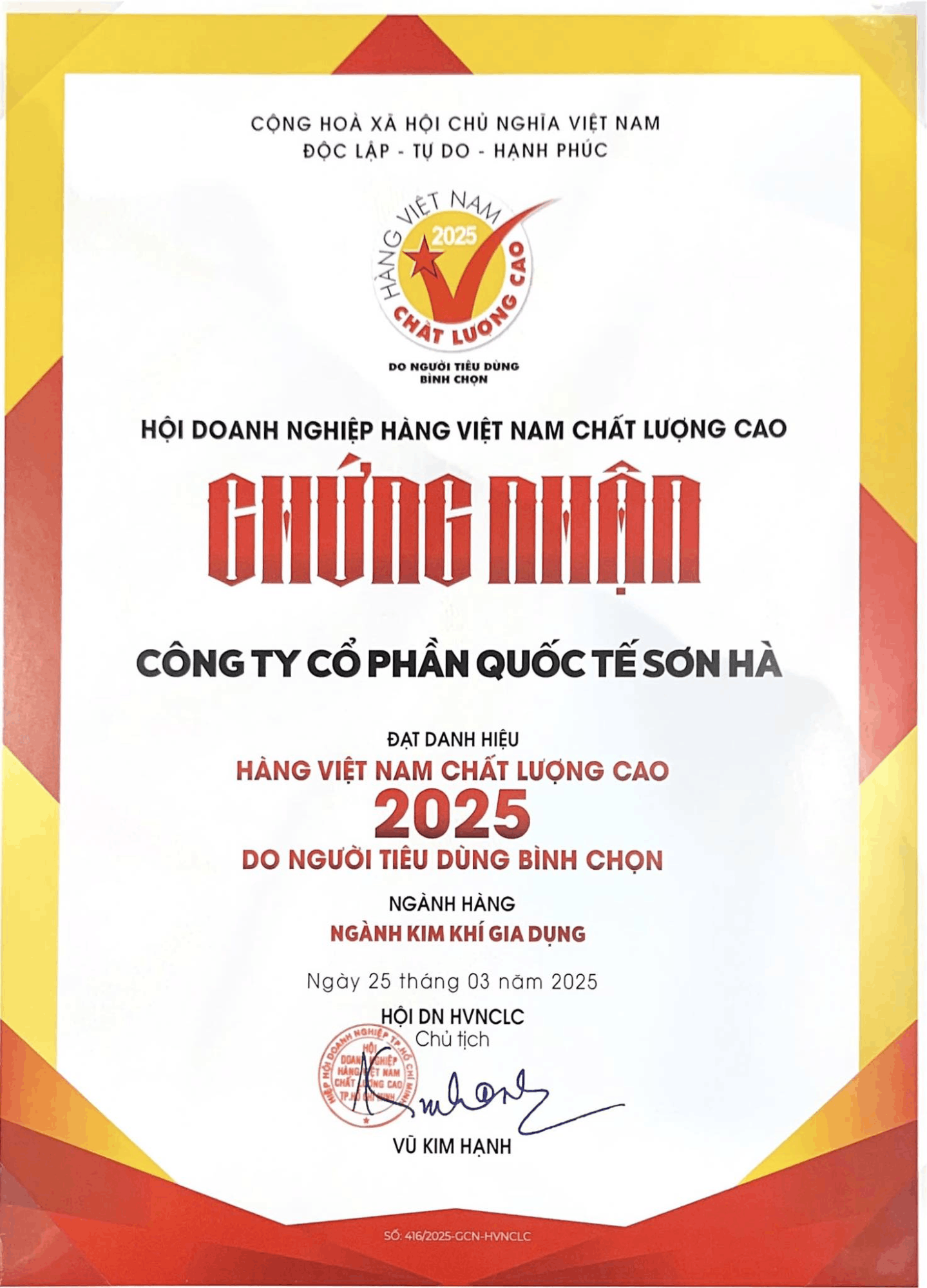 Trong bối cảnh người tiêu dùng ngày càng yêu cầu cao hơn về chất lượng, sản phẩm muốn giữ vững vị thế phải đáp ứng đồng thời các tiêu chí về độ bền, tính an toàn và giá trị sử dụng… Năm 2025 đánh dấu cột mốc 22 năm liên tiếp Tập đoàn Sơn Hà được vinh danh giải thưởng “Top 1 Hàng Việt Nam chất lượng cao”. Đây là minh chứng thuyết phục cho chất lượng vượt trội, sự đổi mới không ngừng và niềm tin từ người tiêu dùng. Chứng nhận cao quý này là động lực để Sơn Hà không ngừng đổi mới, sáng tạo, tiên phong, ứng dụng công nghệ nhằm tạo ra những sản phẩm ưu Việt.