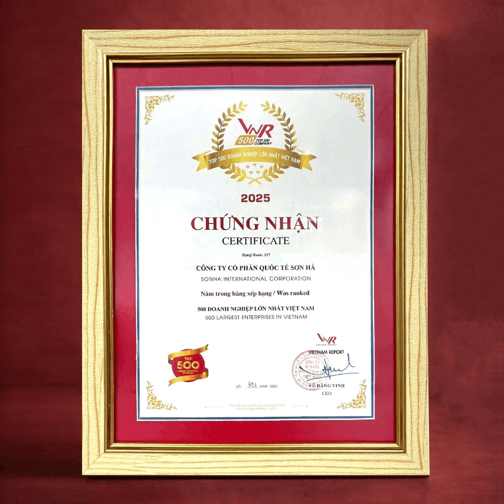 Danh hiệu “Top 500 doanh nghiệp lớn nhất Việt Nam (VNR500)” tiếp tục củng cố vị thế của Sơn Hà trong cộng đồng doanh nghiệp. Được xướng tên trong bảng xếp hạng năm 2025 cho thấy được năng lực quản trị và sức cạnh tranh ổn định qua thời gian. Kết quả này tiếp tục khẳng định vị thế của Sơn Hà là một tập đoàn đa ngành có nền tảng vững chắc, phát triển theo định hướng dài hạn.