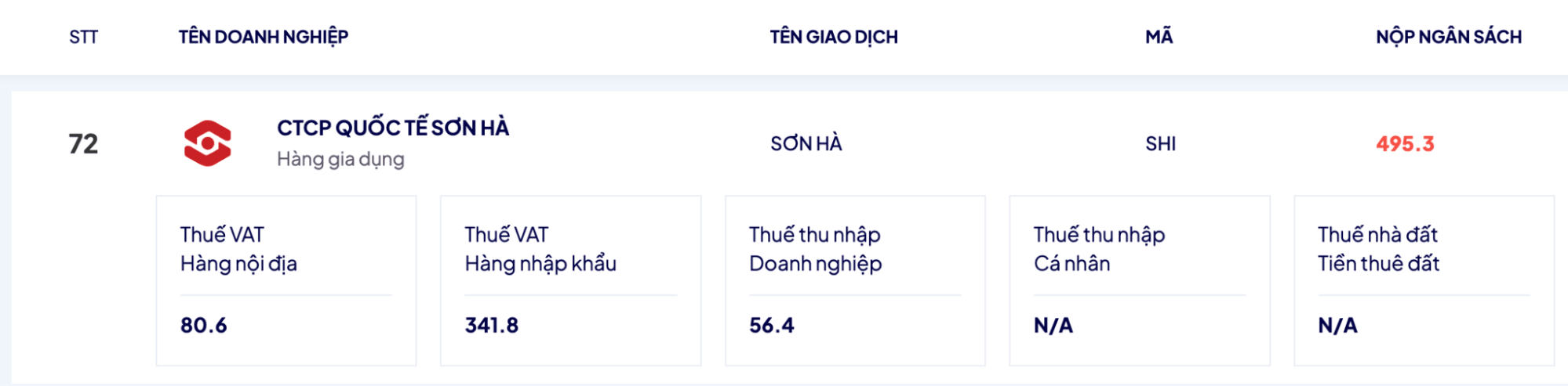 Song song với đó, “Top 100 doanh nghiệp tư nhân nộp ngân sách lớn nhất Việt Nam” phản ánh rõ trách nhiệm xã hội và nghĩa vụ đối với quốc gia trong công cuộc phát triển kinh tế và tinh thần phụng sự xã hội. Tại bảng xếp hạng, Sơn Hà đứng ở vị trí 72/100 doanh nghiệp, đóng góp cho ngân sách nhà nước 495.3 tỷ đồng.