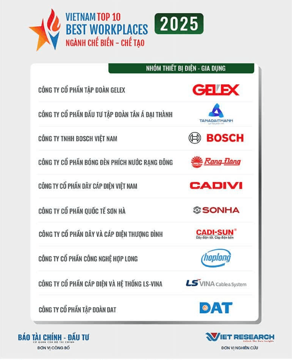 Tập đoàn Sơn Hà tiếp tục được ghi nhận ở phương diện phát triển con người khi vinh dự lọt “Top 10 Nơi làm việc tốt nhất Việt Nam năm 2025” (Ngành Chế biến – Chế tạo) tại Bảng xếp hạng VBW10 do Viet Research phối hợp với Báo Tài chính – Đầu tư đánh giá, thẩm định và công bố.