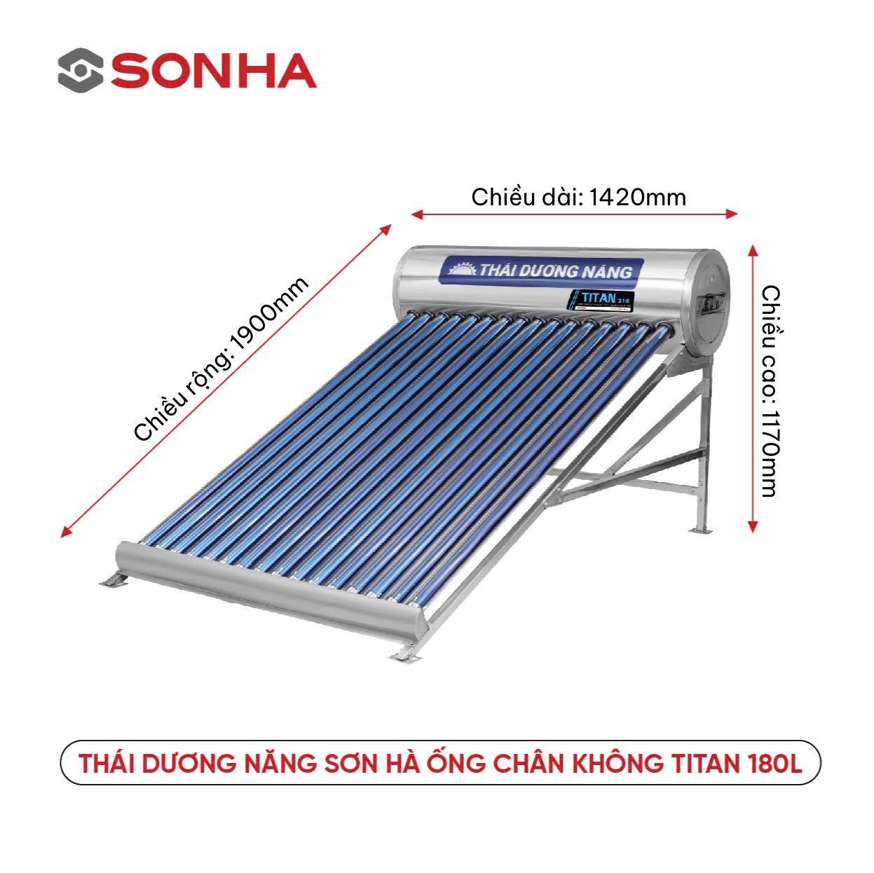 Thái dương năng Sơn Hà TITAN 316 18F58 - 180L là sản phẩm thuộc phân khúc cao cấp hội đủ mọi ưu điểm của ba dòng Thái dương năng ECO, GOLD và DIAMOND, cho khả năng hấp thụ và lưu giữ nhiệt vượt trội, độ bền vượt thời gian, thách thức mọi nguồn nước và điều kiện thời tiết khắc nghiệt nhất.